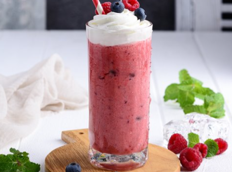 2Tuang cairan ke dalam blender lalu haluskan dengan es batu.